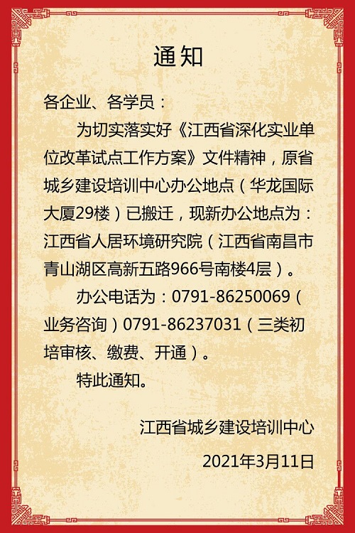 為切實落實好《江西省深化實業單位改革試點工作方案》文件精神,原省城鄉建設培訓中心辦公地點(華龍國際大廈29樓)已搬遷,現新辦公地點為:江西省人居環境研究院(江西省南昌市青山湖區高新五路966號南樓4層)。